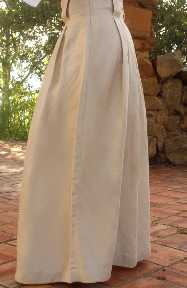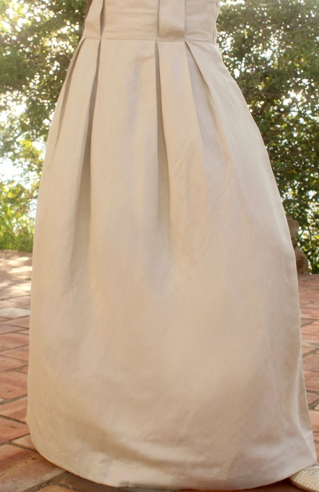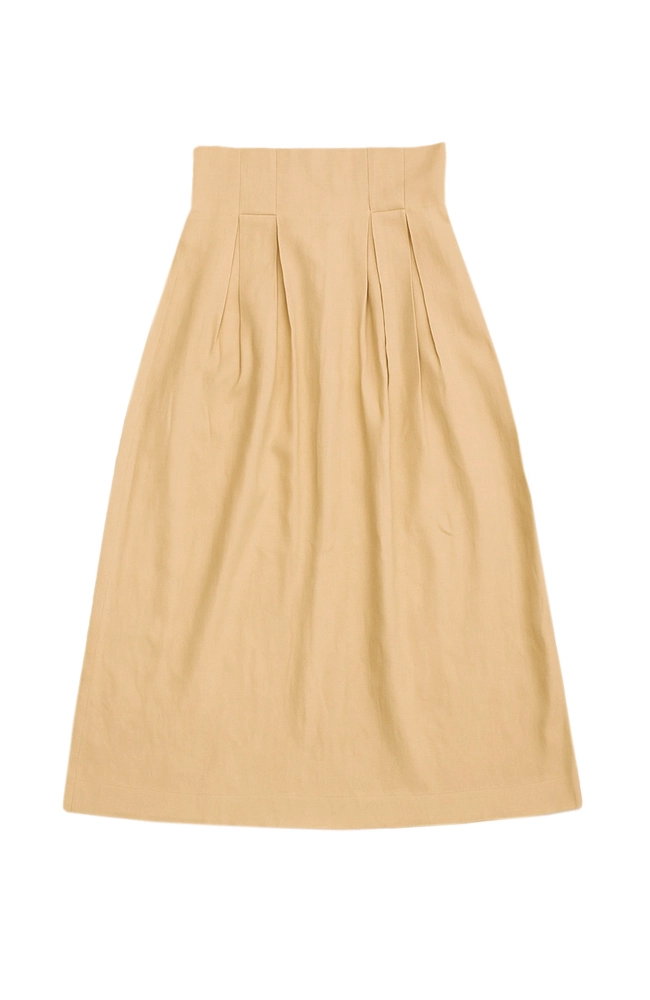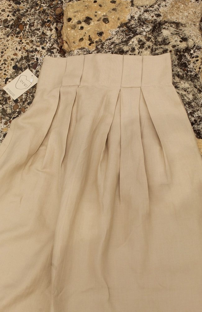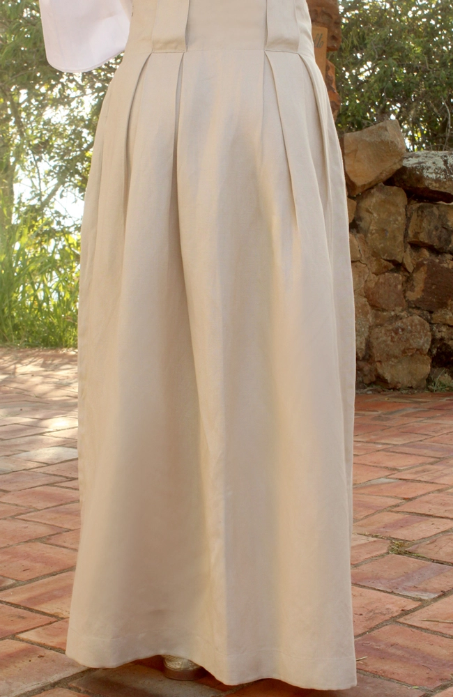 La Falda María, hecha en lino natural, resalta con su cintura alta estructurada y pinzas laterales que estilizan la figura. En color arena, es versátil y atemporal, ideal para combinar con blusas o tops en tonos cálidos y neutros.
