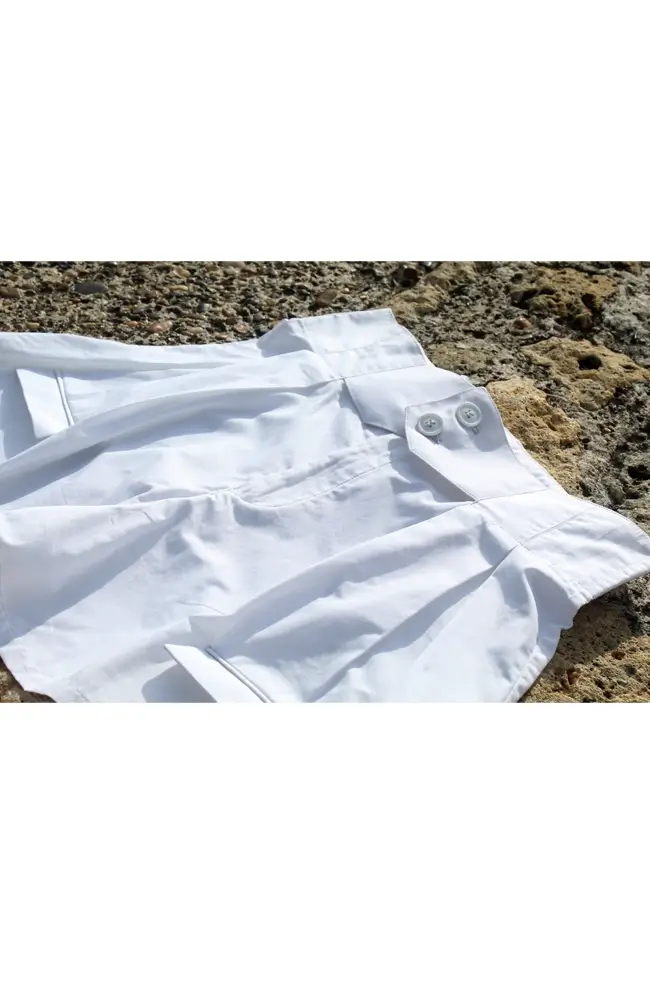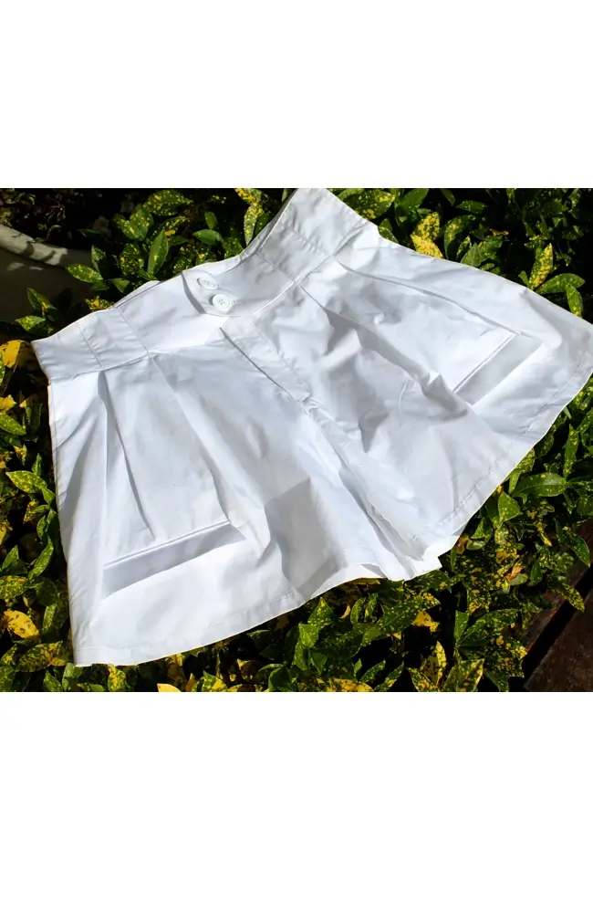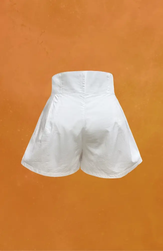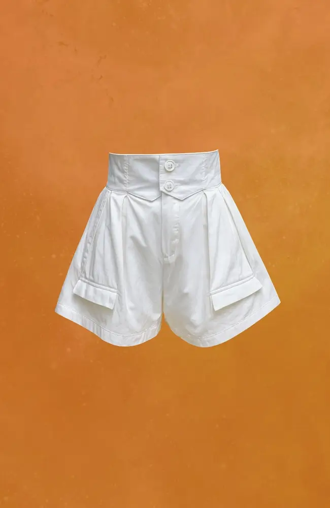 El Short Ana está confeccionado en algodón 100%, con cintura alta estructurada y doble botón frontal. Incorpora pinzas delanteras que aportan volumen y definición, bolsillos laterales tipo ribete y prenses marcados que generan una estructura limpia y una caída definida. Su silueta amplia garantiza comodidad y versatilidad.